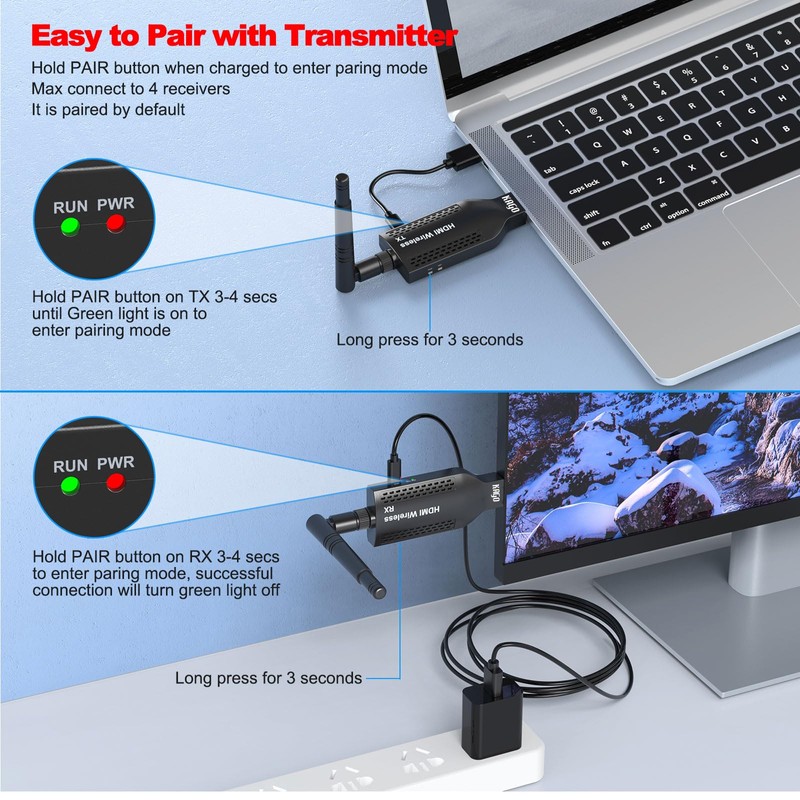 - Plug and Play Convenience: The wireless video transmitter and receiver are pre-configured for easy setup. Simply connect the transmitter to your HDMI source and the receiver to your display—no software or drivers needed