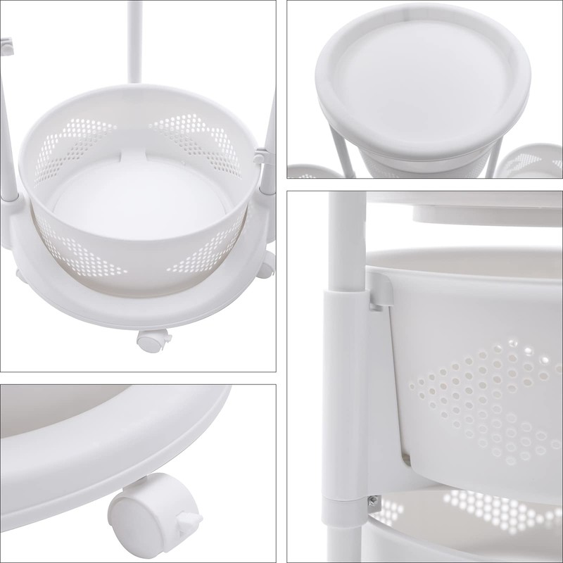 Kaibrite Rotating Kitchen Storage Rack, Multi-Layer Revolving Basket Kitchen Shelf with Wheels, for Kitchen, Bathroom, Laundry Room, Garage, White (3-Layer)
