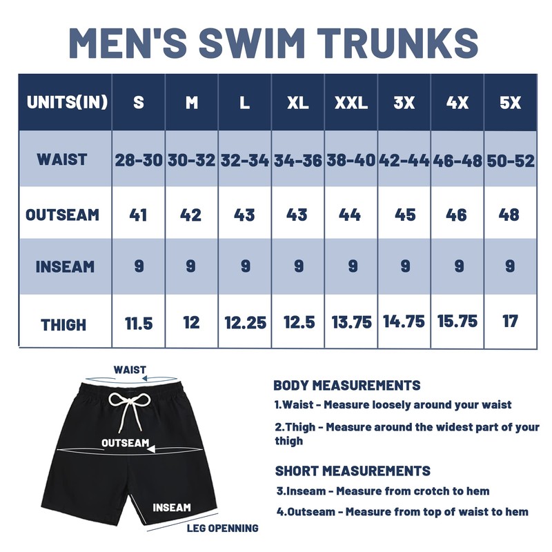 - 【8 Sizes for Everyone】- No matter you are a big and tall guy or slim fit guy, our men’s swim trunks sizes from small xxlarge 3x 4xto 5X sizes with standard US men sizes. These big and tall swim trunks are the must have for summer beach.