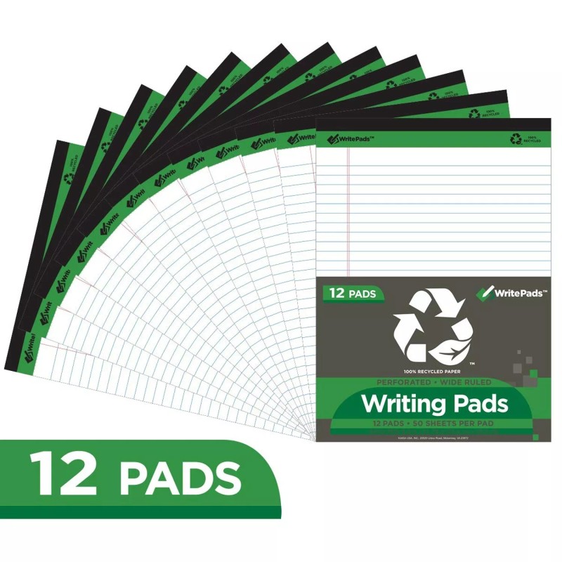 KAISA Legal Pads Writing Pads Recycled Paper, 8.5"x11.75" Wide Ruled, 50 sheets 8-1/2"x 11-3/4" Perforated Writed Pad, White Pack of 12pads, KSU-5293