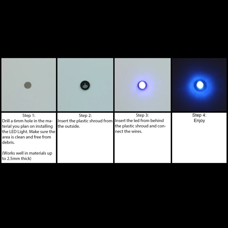 Our 5mm LED Diodes feature Shrouds that allow for easy mounting on a variety of surfaces. Simply drill a hole, insert the Shroud and then clip our LED in place! It allows for a clean and professional installation. You can create various patterns and fill them with our LED's, only your imagination is the limit! The LED's will work with any 12V power source; allowing you to connect several of them together from one power lead.