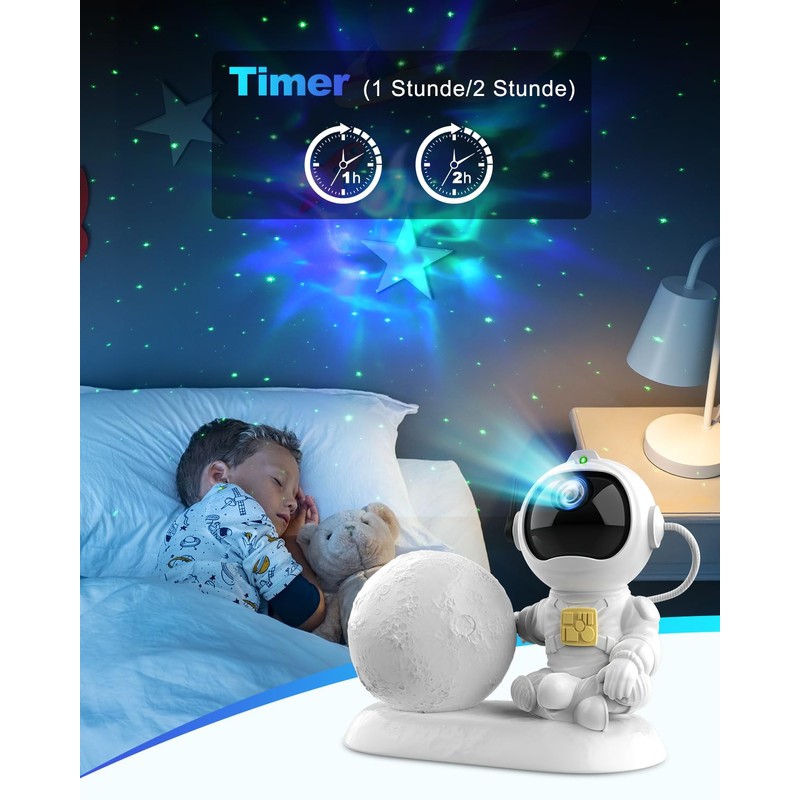 - 【Astronaut Galaxy Projector】The projector is designed in the shape of an astronaut. Its head is magnetically attached and can be rotated freely to adjust the projection angle of the nebula. Automatic shutdown after 8 hours without operation. You can also set a timer(1H/2H), it will turn off when the children sleep.