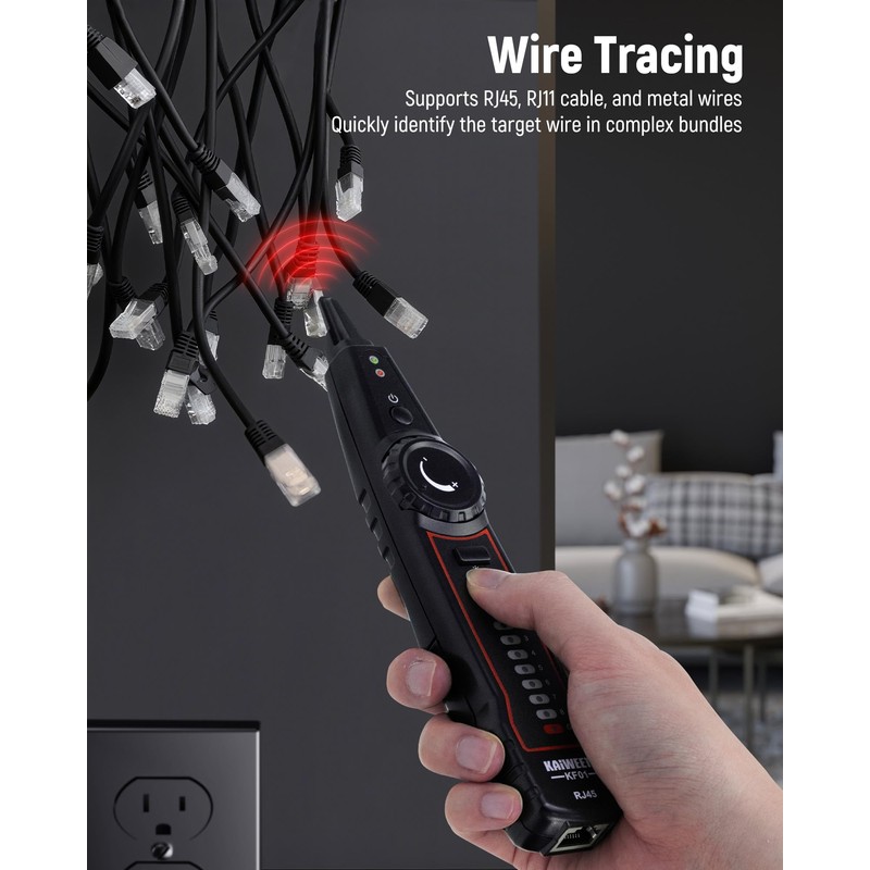 - Versatile Wire Tracing: Quickly identify and trace the target cable from a bundle without damaging the insulation—ideal for locating RJ11 and RJ45 cables. It also supports tracing other metal wires, such as electrical and speaker lines, using the included alligator clip adapter. Note: Be sure to power off the cable before tracing metal wires to avoid damaging the device