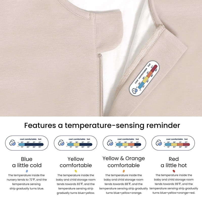 - Temperature Sensing Strip - Exclusive Design by Kaiya Baby. Our clothing features an internal temperature sensing strip located at the chest area. This strip displays the surface temperature where the product contacts the skin, allowing parents to adjust the baby's clothing based on temperature changes without physically touching the baby, ensuring a peaceful sleep.