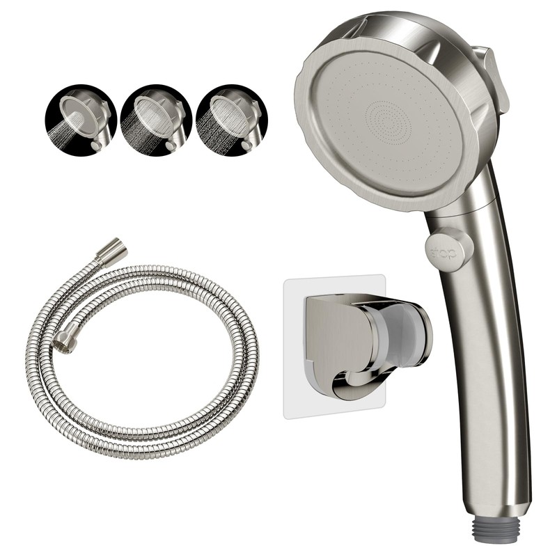KAIYING Drill-Free High Pressure Handheld Shower Head with ON/OFF Switch, 3 Spray Modes - Brushed Nickel