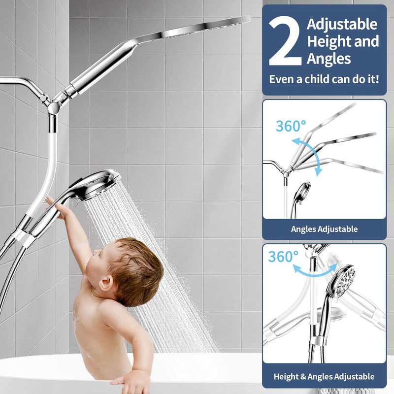 • 【Adjustable Shower Angles】 - The solid brass swivel ball joint allows you to easily adjust the rainfall showerhead in 360 degrees, providing you a comfortable shower angle. Unlike other extension arms that will leak or become unstable, this brass joint ensures durability and stability. Also, the flexible adjustable bar allows you to easily adjust the angle and height of the handheld showerhead to to meet the needs of different heights and personal preferences.
