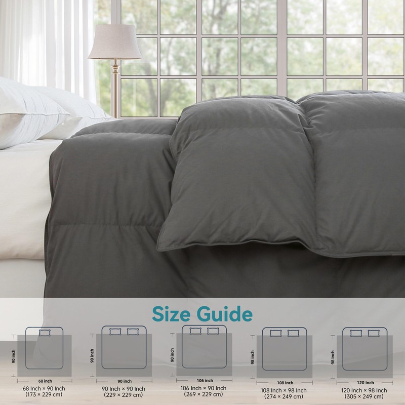 - Premium Material: Filled with goose feather down(75% feathers & 25% down), this comforter provides exceptional warmth and comfort. The high-quality filling is carefully chosen to deliver superior insulation, making it a cozy and ethical choice for your bedding essentials. Indulge in the perfect balance of plushness and support for a truly restorative sleep.