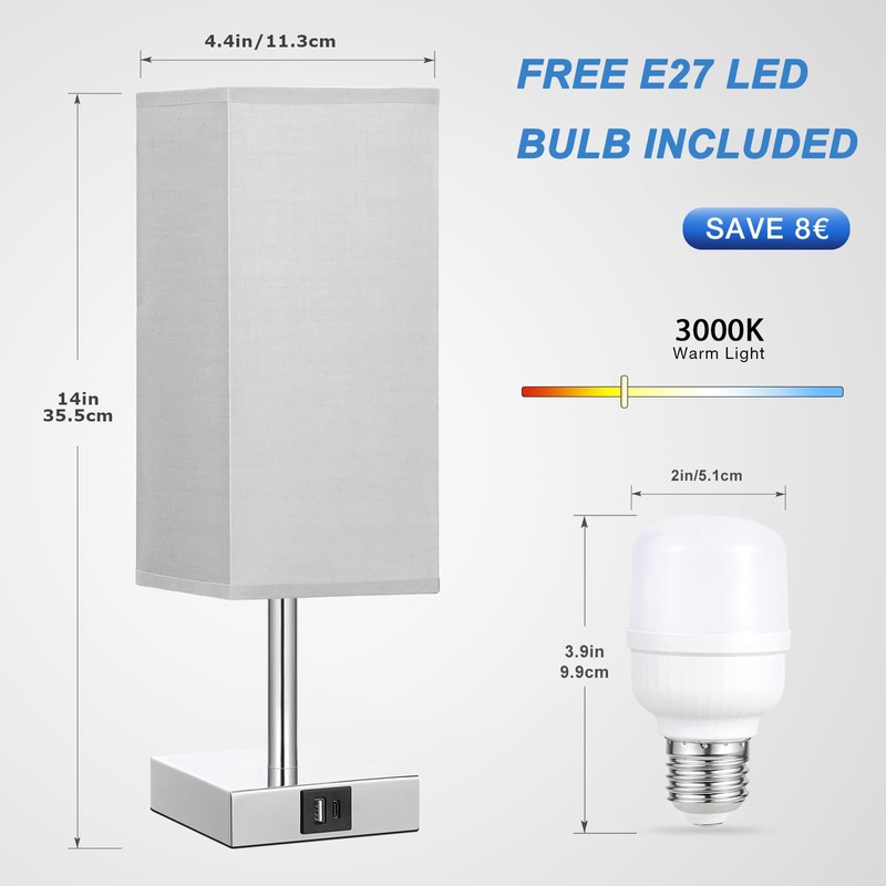 - E27-LED-Glhbirne im Lieferumfang Enthalten- Um Ihnen Probleme bei der Suche nach der richtigen Glhbirne fr die Tischlampe zu ersparen, wird das Paket mit einer 3000K-LED-Glhbirne mit E27-Sockel geliefert. Die Glhbirne kann stabiles warmwei?es Licht abgeben und Ihre Augen schtzen. Kein Flimmern, Energieeinsparung, die Lebensdauer betr?gt das 30-fache der einer gew?hnlichen Glhbirne. (Die LED-Ersatzlampe fr diese Nachttischlampe mit Ladefunktion ist ASIN: B0C5HZLN3F)