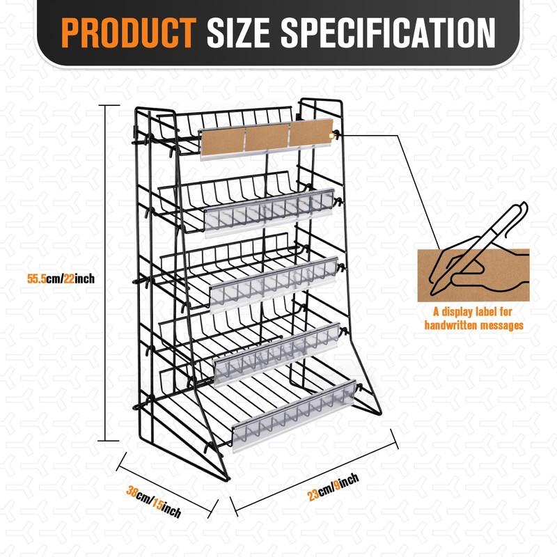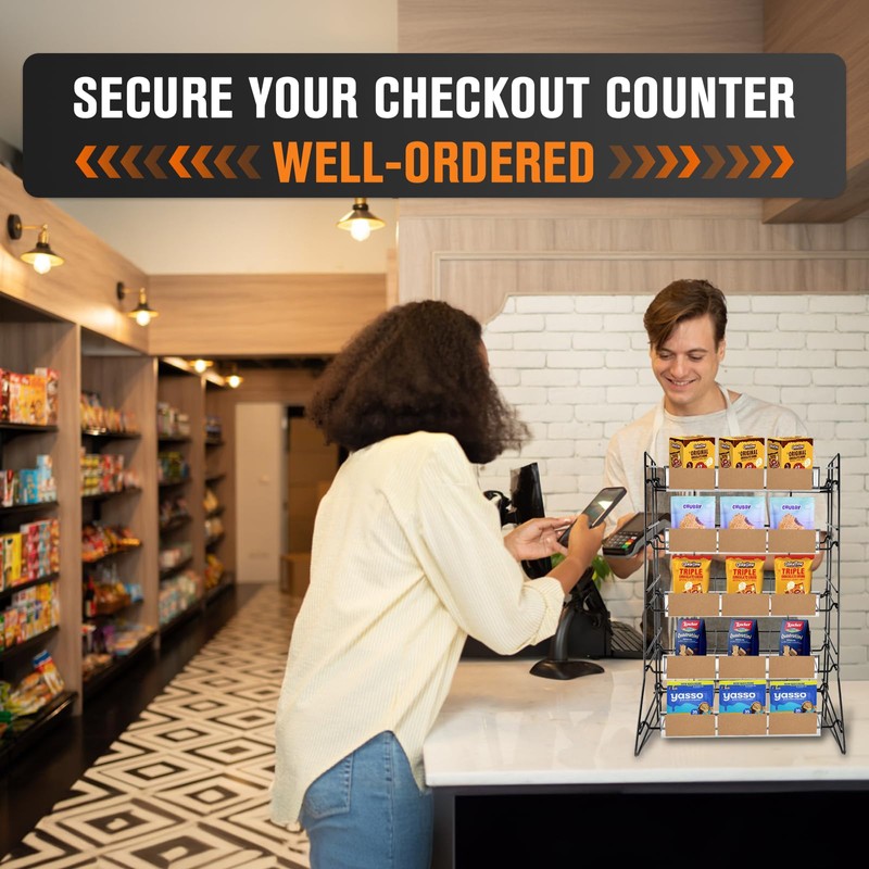 - Maximize Space with Compact Design: With its 5-tier layered design, this snack display rack maximizes the use of space and effectively displays a wide range of snacks and candies. The cascading effect created by the tiered shelves allows customers to easily view all available options while taking up minimal space. Keep your space neat and organized with this convenient home solution