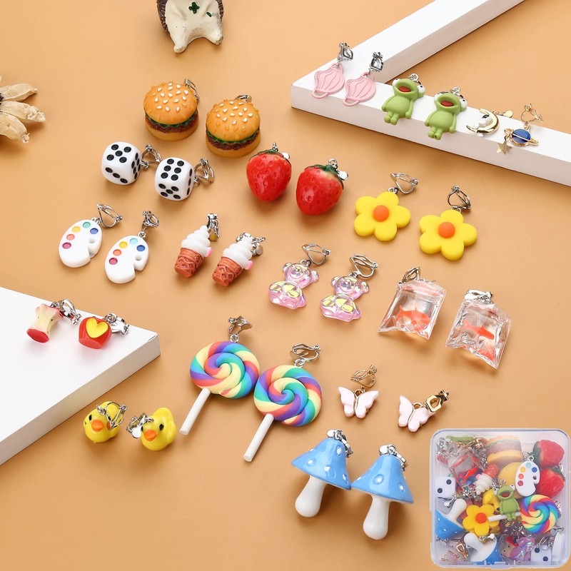 - Weird Clip on Earrings Set: You can get 16 pairs cute clip earrings with different designs. Including paint palette, yellow daisy flower, ice cream, lollipop, hamburger, yellow rubber duck, red strawberry, red goldfish bag, pink butterfly, blue mushroom, green frog, dice, planet, astronaut and more. Enough choice for you to choose the proper clip-on earring to match your outfits. An earring box is given for your convenience.