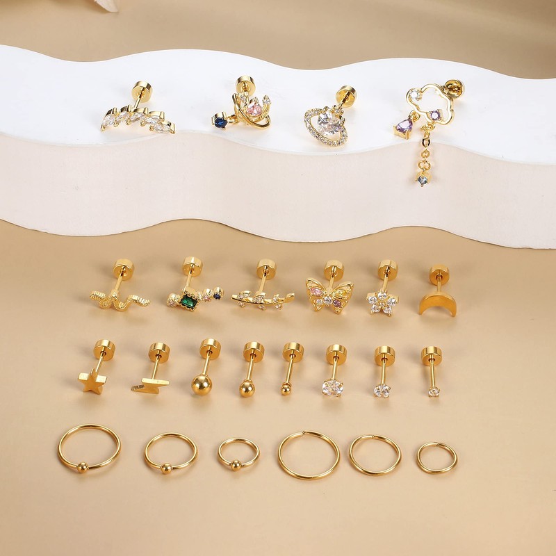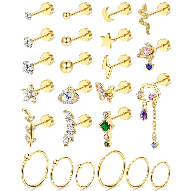 - Helix piercing set: with one order, you will receive 24 pieces helix piercing for women set. Includes CZ cartilage ear piercing gold silver, ball earrings, moon earrings, star earrings, butterfly earrings, flash earrings, flower earrings with flat back, etc.