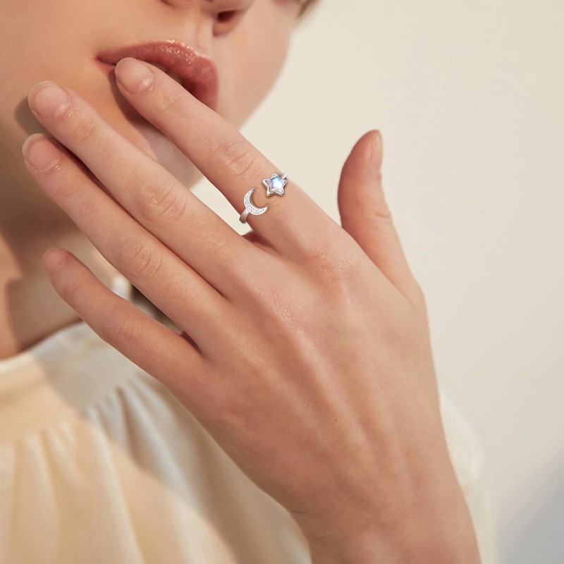 Kakonia 925 Sterling Silver Rings for Women Girls Adjustable Moonstone Opal CZ Open Ring I Love You to The Moon&Back Ring Moon Star Stackable Knuckle Thumb Promise Wedding Engagement Rings