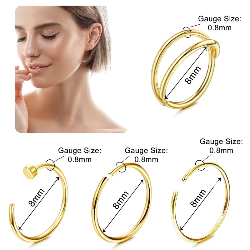 - Affordable nose ring set: with 8 nose rings (2 seamless nose hoops, 2 semi-open nose hoops, 2 moon nose hoops, 2 double row nose hoops) and 4 L-shaped nose studs (1.5/2/2.5/3 mm cz), a total of 12 pieces nose piercing jewellery, also perfect as ear/tragus/helium. ix-/cartorpel/nose/lip ring, give you different wearing options.