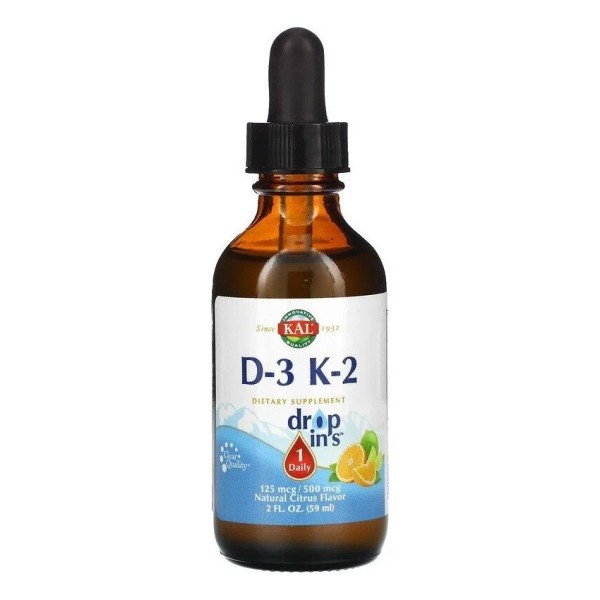 Kal Vitamina D3 + K2 Líquida 5000 IU 59 mL en México es un suplemento líquido diseñado para fortalecer huesos, dientes y mantener una correcta función cardiovascular. La combinación de vitamina D3 y vitamina K2 actúa sinérgicamente para mejorar la absorción del calcio y su correcta distribución en el cuerpo.