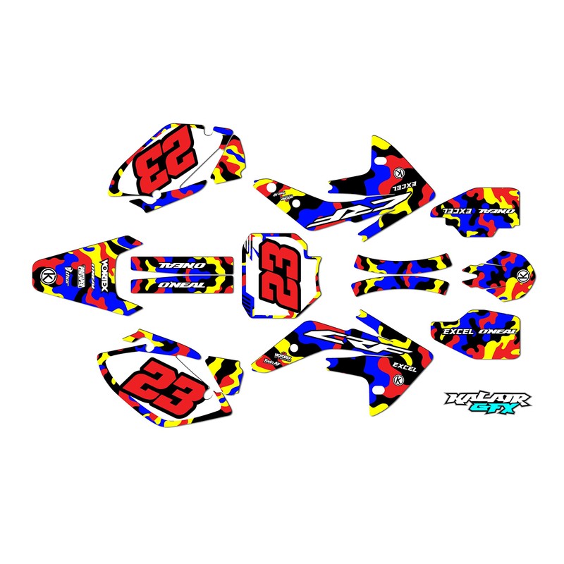 Fits CRF150R (2007-2023) on OEM or OEM-replica plastics. Complete graphics kit, includes all pieces shown in the listing. Plastics NOT included.
