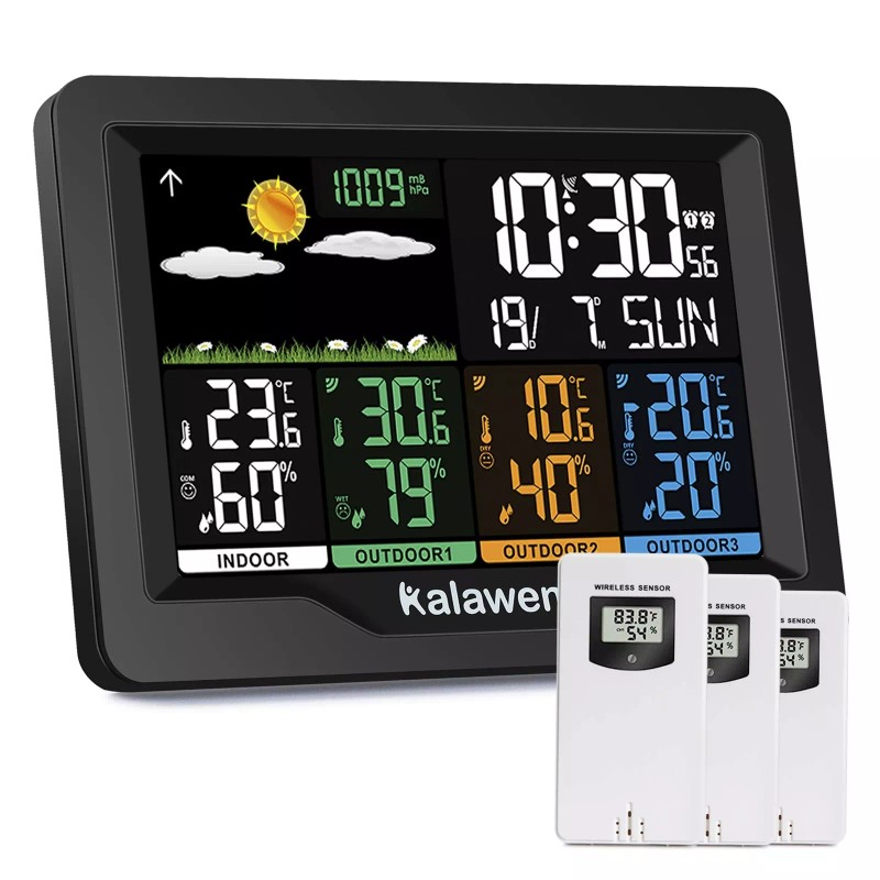 - WEATHER STATIONS WIRELESS INDOOR OUTDOOR MULTIPLE SENSORSKalawen weather stations wireless indoor outdoor come with 3 sensors, allowing you to view the indoor and outdoor temperature and humidity of up to four different areas on the screen simultaneously. Such as your bedroom, baby room, kitchen, yard, or other areas. The sensors have a range of up to 200 feet in an open area, providing accurate readings no matter where you place them.