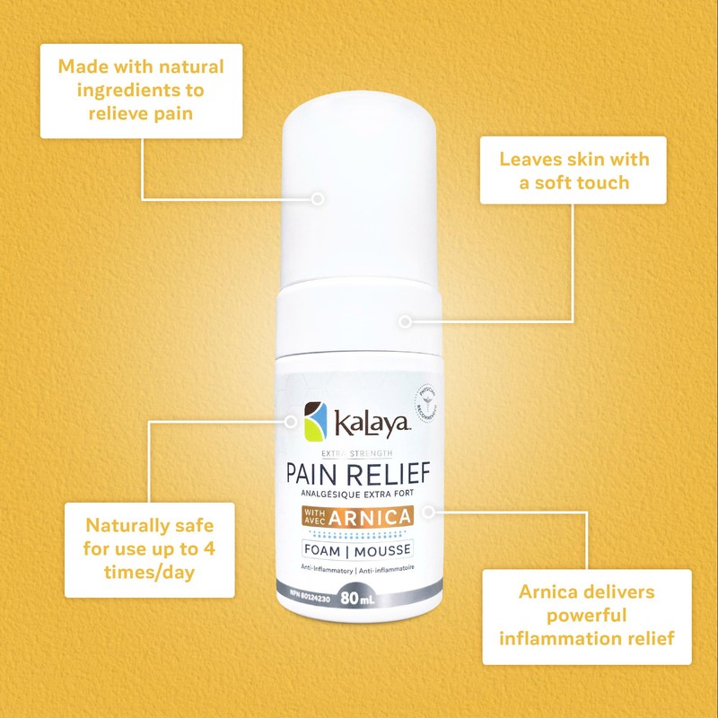 Try KaLaya Pain Relief Foam, a scientifically tested solution by medical professionals for effectively alleviating your aches and pains. Our specialized formula includes active natural ingredients such as Arnica, Methyl Salicylate, Menthol, Camphor, and Eucalyptus. Together, they work in synergy to provide temporary relief to muscle pain and joint pain. KaLaya Pain Relief Foam is ideal for adults and children aged 12 years and over. It is specifically designed to offer respite from discomfort related to back aches and muscle soreness. This pain remedy works by blocking pain signals, providing you with the much-needed relaxation and recovery. The KaLaya Pain Relief Foam is easy to apply and absorbs quickly, making it an ideal muscle rub for any time of the day. Its refreshing scent, resulting from the eucalyptus and camphor, makes the application a pleasurable experience. Arnica, a key ingredient in our formula, is known for its natural pain relief properties. When used in conjunction with other ingredients, it offers a potent and effective pain relief remedy.