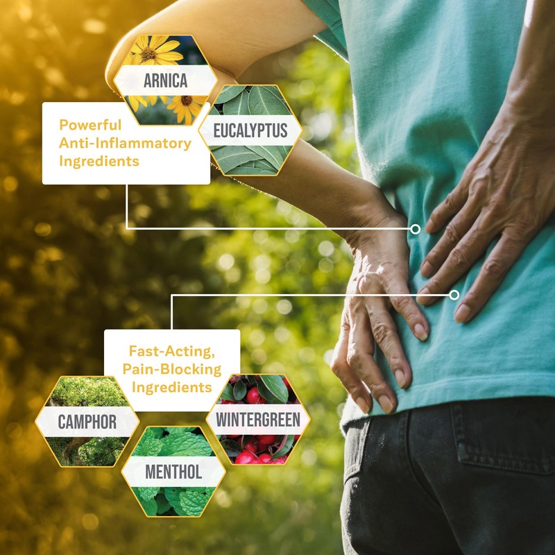 • NATURAL PAIN BLOCKERS. This product is formulated with natural active pain-blocking ingredients including Arnica, Methyl Salicylate, Menthol, Camphor, and Eucalyptus. It serves as an effective pain relief remedy for adults and children over 12.