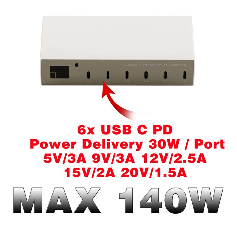 The six USB-C ports share a total power of up to 140W with a maximum power of 30W per port.
