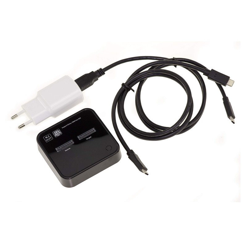 - Function 2, Cloning one SSD to another: Offline, i.e. not connected to a PC or smartphone, but only to one power supply, this dock allows you to clone the contents of one SSD to the other. The progress of cloning is indicated by 4 LEDs (25%, 50%, 75%, 100%)