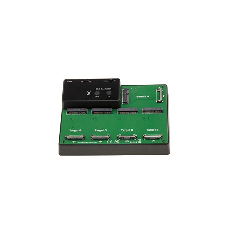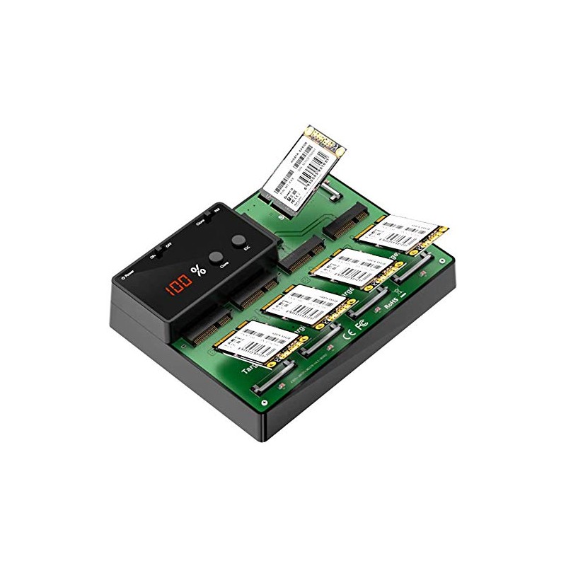 - Function 2, clone one SSD to the other 4: Offline, i.e. not connected to a PC, but only connected to its power supply, this dock allows the contents of one SSD ("source") to be identically cloned to the other 4 ("destination"). Set the cursor to "Clone" and press the button on the front, that's all! Displays clone progress through a digital counter