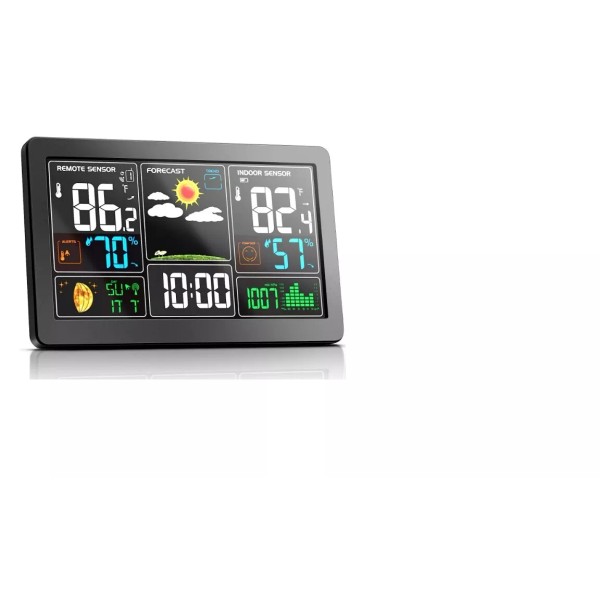 - 【COLORFUL DISPLAY MULTI-FUNCTIONAL WEATHER THERMOMETER】The 7.5" large-screen display has great color matching and rich display content, allowing you to clearly read indoor and outdoor temperature and humidity information, weather changes, atmospheric pressure index, moon phase, yard clock, date, comfort indicator, temperature alarm, etc.