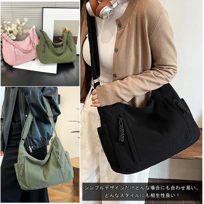 KALIDI Women's Shoulder Bag, Tote Bag, Crossbody Bag, Large Capacity, A4, Interior Pockets, Corduroy Eco Bag, Zipper, Does Not Hurt Your Shoulders, Plain, Travel Bag, Overnight, Work or School,