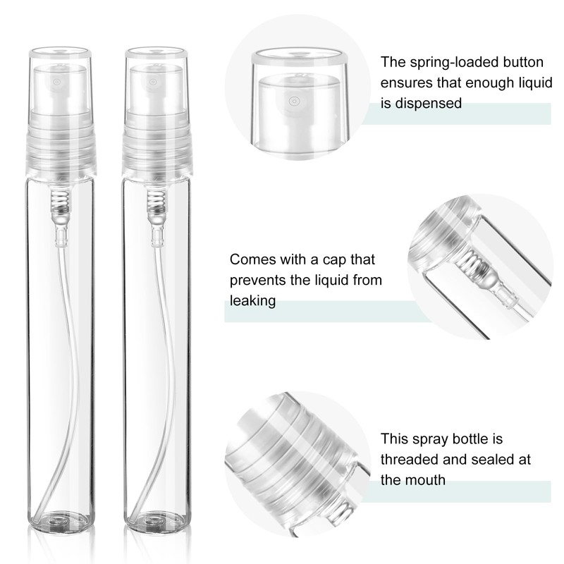 - 【Package Included】This set includes 10 5ml mini clear plastic spray bottles. These small empty sample containers are designed to be easy to open - just pull up or push to the side to pop open, no unscrewing required. The compact size and lightweight design make them perfect for travel, gym or daily use
