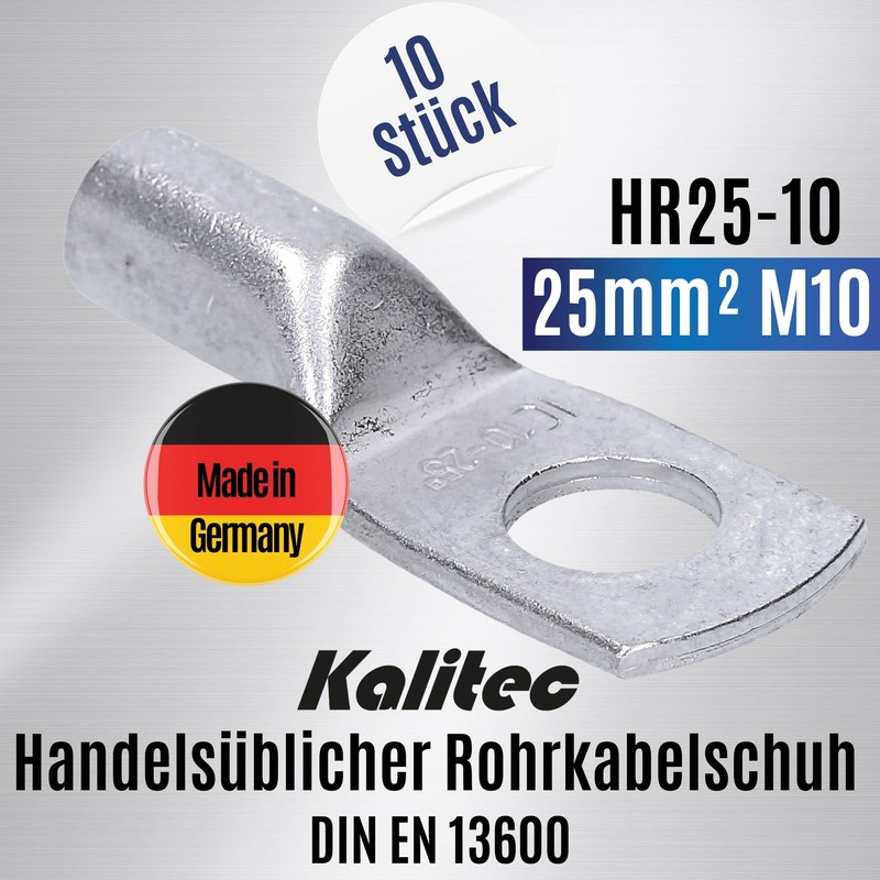 Kalitec HR25-10 Standard Pipe Cable Lugs 25 mm² M10 I without Viewing Hole I Made in Germany Pack of 10