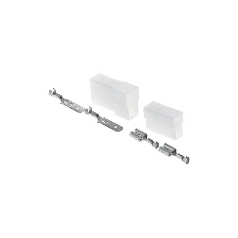- Included in this connection plug set are 1 x Fastin-Faston receptacle housing 2 pin, 1 x flat connector housing 2 pin, 2 x blade receptacles and 2 x flat connectors.