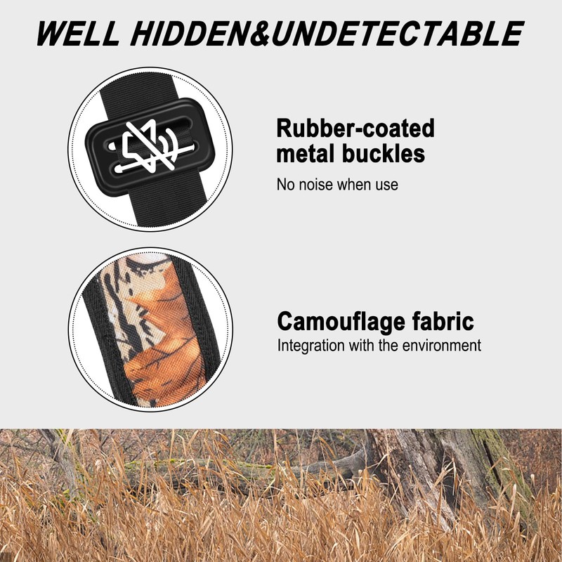- Well Concealed & Undetectable: KALKAL hunter safety system harness is uniquely designed with a camouflage color to blend in with the environment and be undetectable in the trees. Also with thick rubberized metal buckles that effectively reduce noise when moving