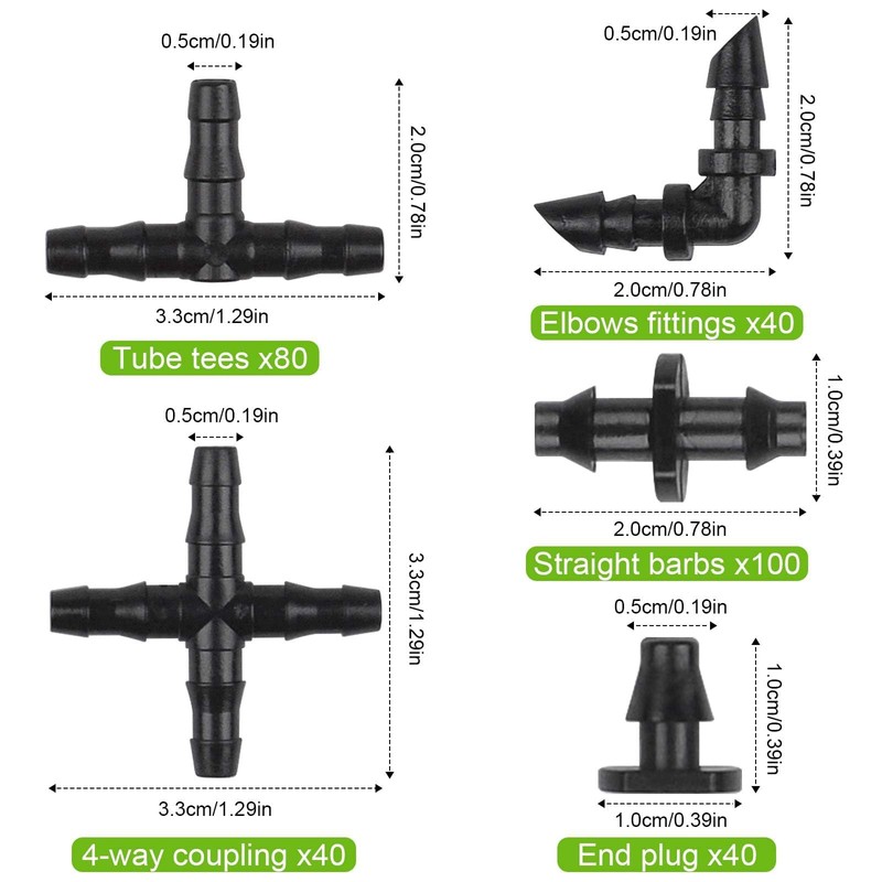 - Especificaciones: Estos kits de riego están diseñados con púas, el tamaño es un surtido de los accesorios de goteo más comúnmente de 1/4 pulgadas. Comprueba el tamaño cuidadosamente antes de comprar.