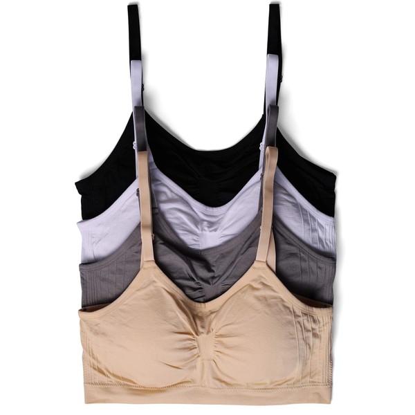 - 4-Pack Womens Cami Bralettes - Pullover Design - No Side Seams - No underwire. Ultimate comfort all day everyday bralettes for women with light support. Lined cups with removable pads in between the lining and the outer fabric.
