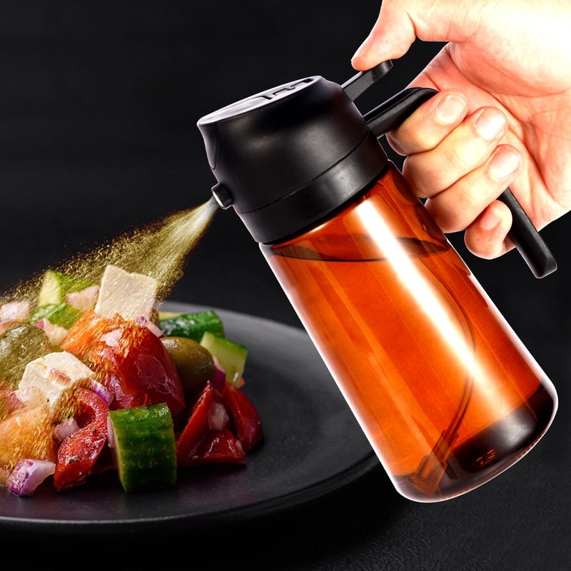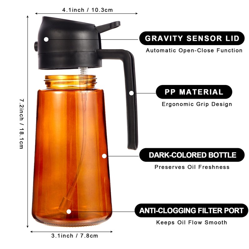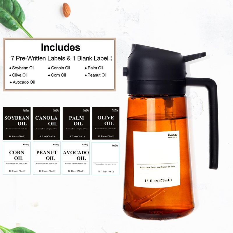 KaloTidy 16oz Olive Oil Dispenser for Kitchen, 2 in 1 Olive Oil Dispenser and Oil Sprayer, Oil Sprayer for Cooking, Brown Lightproof Oil Dispenser with stickers (Brown Bottle with Black Cap)