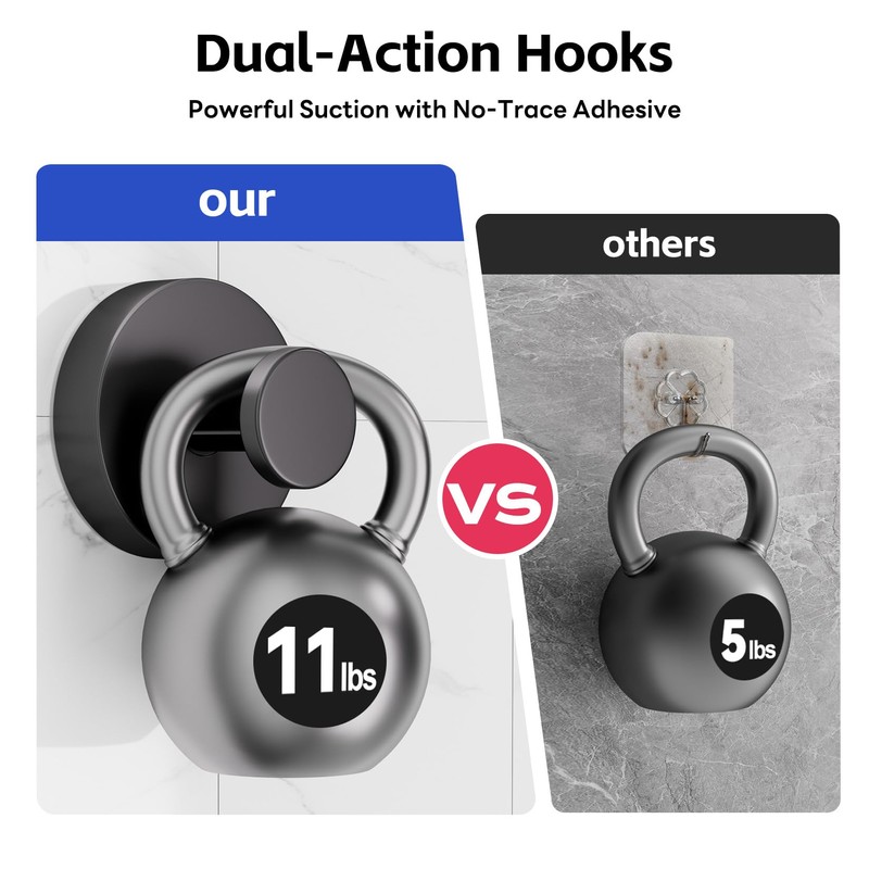 • Up to 11 lbs Capacity: Advanced silicone suction cups with adhesive reinforcement hold 11lbs securely, making them perfect for hanging towels, robes, coats, and more