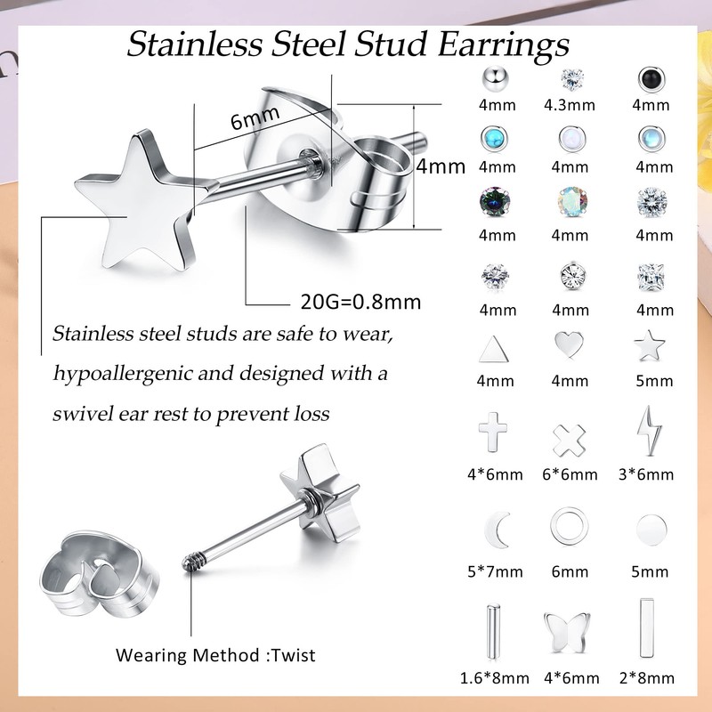 - Small stud earrings set for women - with one order you will receive 24 pairs of stainless steel stud earrings, including zirconia, star, moon, triangle, cross, star, butterfly, flash and other cartilage piercing earrings. Available in a variety of styles and shapes, it can be worn alone or stacked in a variety of styles to meet all your needs for multiple piercings. Suitable for all ages
