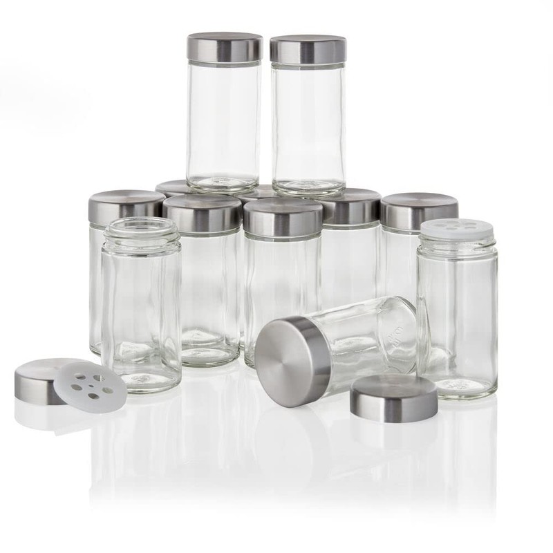 of glass, Each jar has a stainless steel cap with a sifter disc for sprinkling