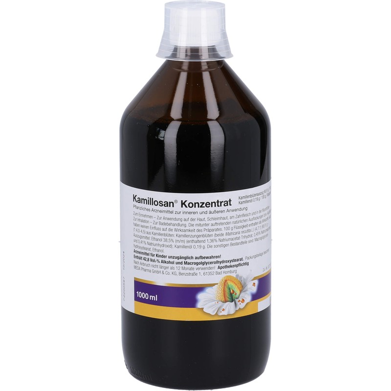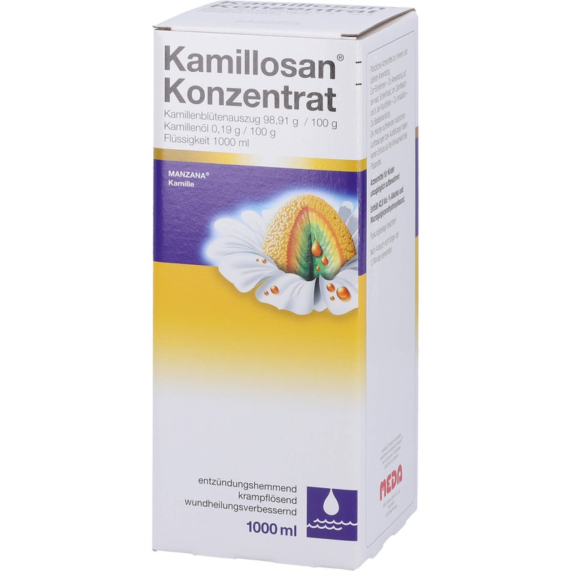 Kamillosan Konzentrat ist ein pflanzliches Arzneimittel zur Anwendung bei Magen-Darm-Beschwerden, bei Entzündungen im Mund- und Rachenraum, bei katarrhalischen Erkrankungen der oberen Atemwege sowie zur äußerlichen Anwendung bei entzündlichen Hautveränderungen. Kamillosan Konzentrat wird angewendet zur Inhalation bei entzündlichen Erkrankungen und Reizzuständen der Atemwege, als Zusatz für feuchte Umschläge, Spülungen oder Waschungen bei entzündlichen Haut- und Schleimhauterkrankungen einschließlich der Mundhöhle und des Zahnfleisches, als Zusatz zu Teil- und Sitzbädern oder Spülungen bei Entzündungen im Analbereich und im Bereich der Geschlechtsorgane und zum Einnehmen bei krampfartigen und entzündlichen Erkrankungen im Magen-Darm-Bereich.