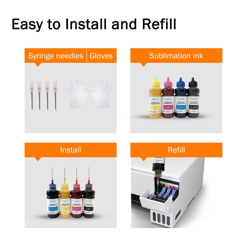 • What you get: Kamo sublimation ink multipack, including 1 x 100ml black, 1 x 100ml cyan, 1 x 100ml magenta, 1 x 100ml yellow, 8 x syringe needles, 4 x disposable gloves and 1 quick start guide. We offer 24 months warranty and 24/7 customer support.