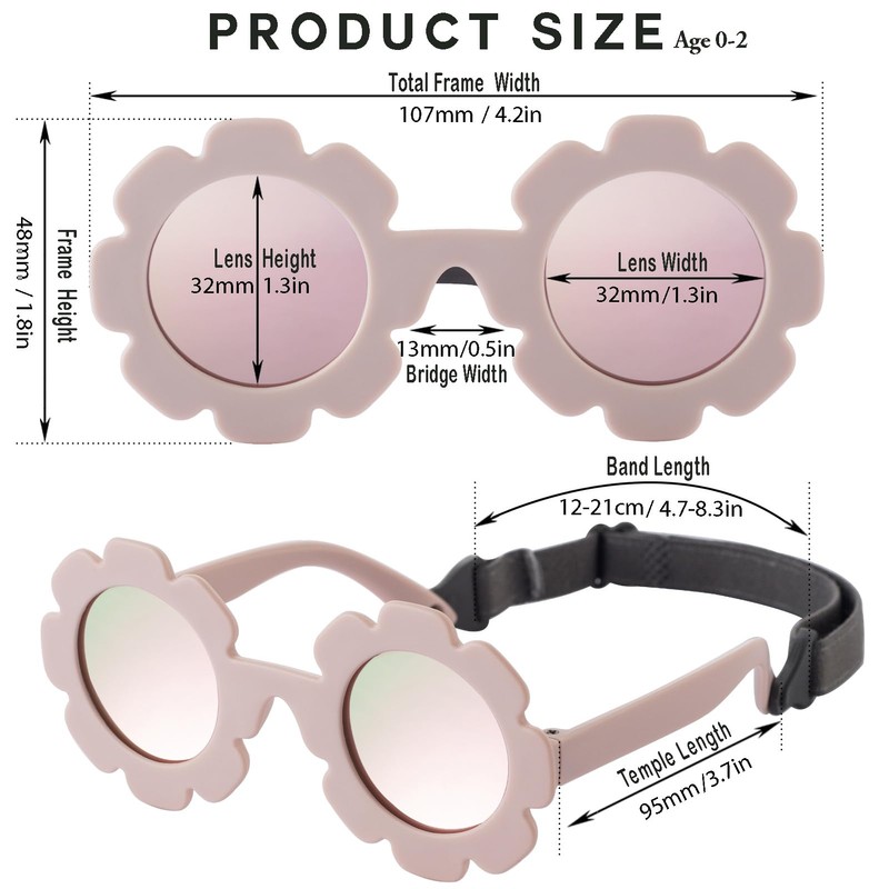- Accessories Included: Each pair of daisy sunglasses comes with a cleaning cloth, a soft pouch, a mini screwdriver to tighten the screws if need be and an adjustable strap to ensure a perfect fit as the baby grows