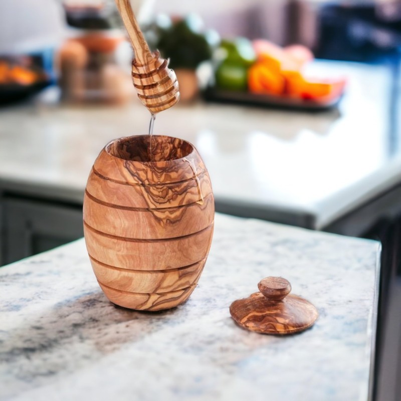 • OLIVE WOOD IS NATURALLY WATERPROOF & DURABLE — Crafted from high-quality olive wood, our honey jars with dipper are designed to last for ages. Its natural waterproofing properties prevent foods and liquids from soaking into the wood, making cleaning the honey jar with dipper easy and ensuring long-term use. The dense, non-porous surface resists odors and stains, maintaining the honey pots beauty over time. Easy to follow care instructions are included.