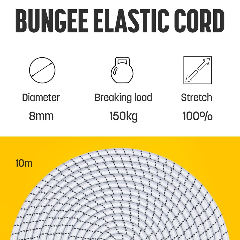 - 💪Superior Material - This 8mm bungee cord consists of multiple highly elastic cores encased in a durable outer sheath. The core is made from natural, non-toxic rubber, which gives the elastic cord 100% elongation and recovery, allowing it to support a weight of 150kg (330lbs). The outer layer is made from wear-resistant polyester, which effectively protects the core from wear and aging.