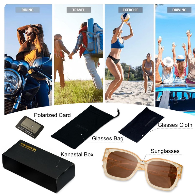 - What You Will Get: KANASTAL polarized sunglasses, packing box, soft bag, cleaning cloth, polarized test card. Packing list to improve your experience with a range of versatile accessories to easy storage and cleaning of your sunglasses. To make caring for and organizing your sun glasses easy