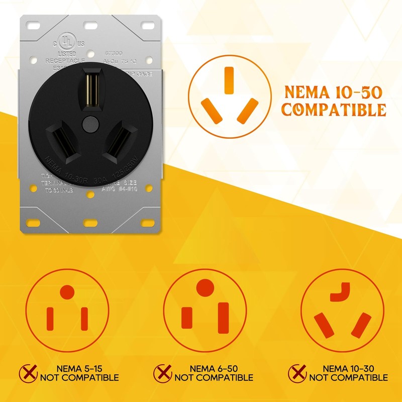 - 10-50R Female Connector: this is a 3 prong female connector that designed to be compatible with NEMA 10-50R outlets and has a capacity of 50 Amp; It is most frequently utilized with generator RV dryer welder ranges or stove