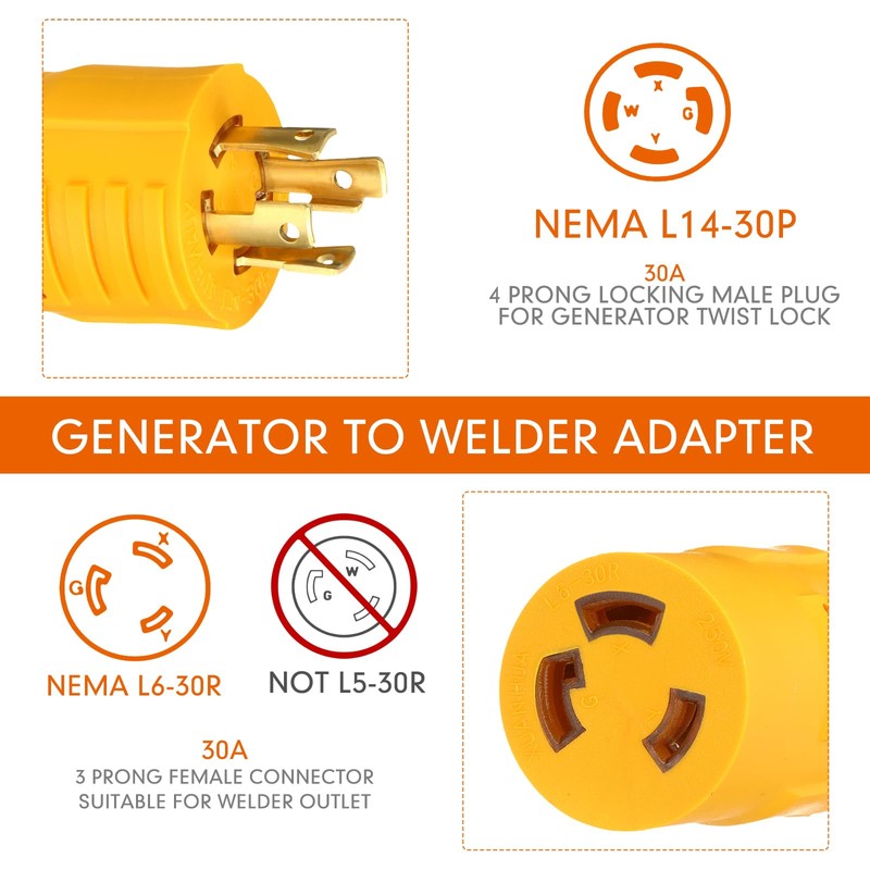 - 30 Amp Generator Adapter: our 4 prong to 3 prong generator power adapter connects NEMA L14-30P twist locking plug to 4 prong generator outlet, and connects NEMA L6-30R twist locking receptacle to 3 prong plug; Support max 30 Amp overload, 240V, max wattage 7500 watts