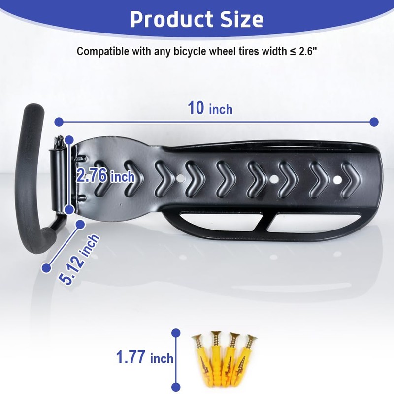 - INNOVATIVE HOOK DESIGN: The bike rack features a thoughtfully designed hook that ensures your bike remains securely in place, preventing any accidental falls or releases. For optimal performance, it’s best to mount the hanger on a solid wall for added stability.