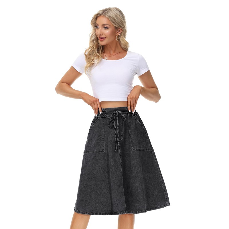 - Women A-line denim skirts design of High Waist accentuate your leg length, make you look taller and slimmer. The Midi Length skirt created a super flattering sihouette. Double Pockets add a finishing touch plus being convenient