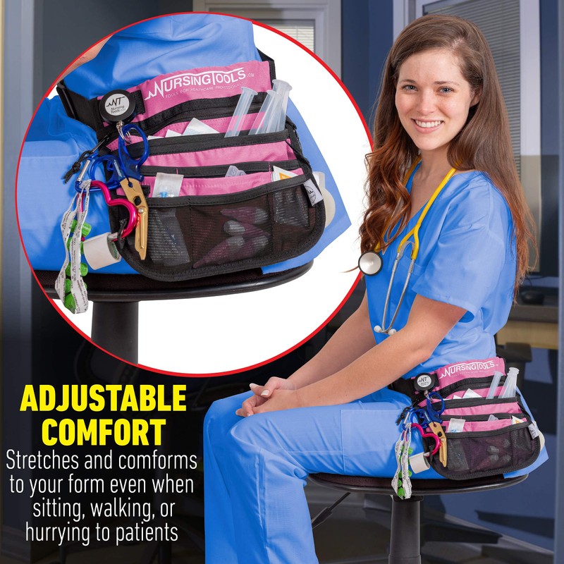- SLIM, CONVENIENT for WORK: Elastic strap of this utility nurse tool belt pouch adjusts to most waistlines. This nurse medical belt is made of deluxe, easy to clean, microfiber. It fits close to the body so it won’t get in the way while you work; Much more practical than bulky fanny packs