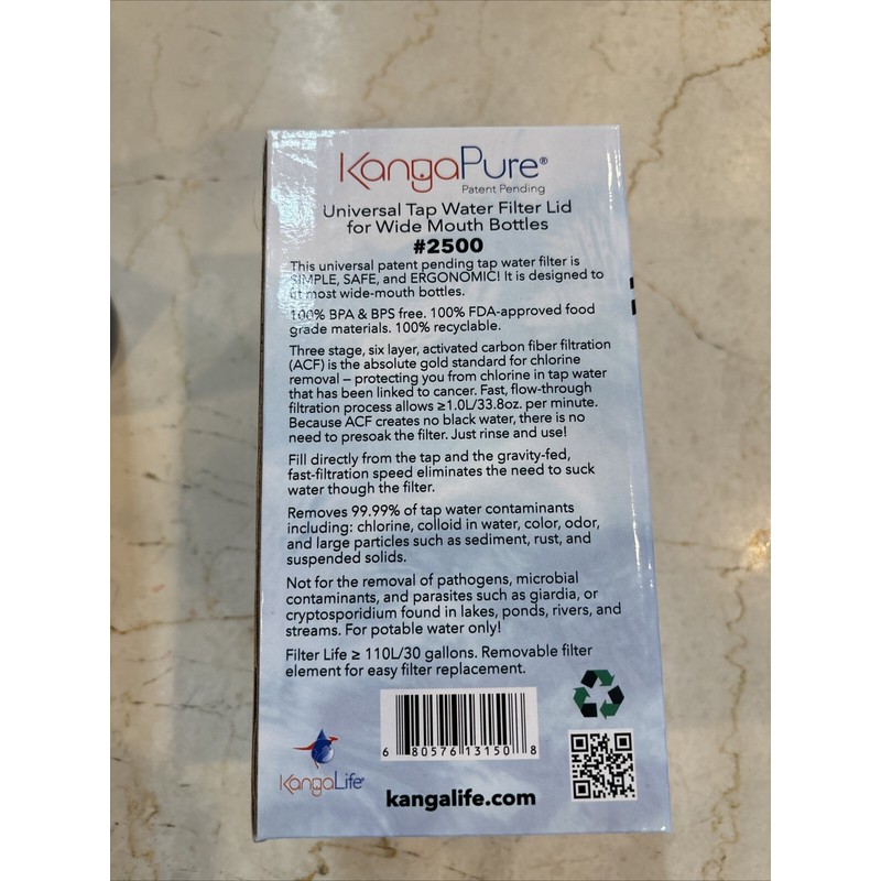 Kangapure 2500 water filter, bottle, carry/drinking lid. Price is for (4) setups. 4 bottles, 4 filters, and 4 carry/drinking lids. I have some extra spare filters and insulating jackets. I will put 2 spare filters and 2 bottle jackets in the bundle. Bottle capacity is 28 oz.
