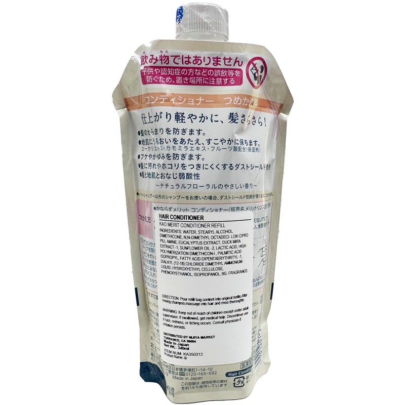 Merit Conditioner [Refilling] Moisturizing and Lightweight! Keep your hair dry until the evening. "Dust Shield Technology" helps prevent dirt and dust from reaching your hair. Prevents hair from becoming tangled; Weakly acidic to the hair and scald; Moisturizes the skin and keeps it fresh; Prevents dandruffles and itching; Gentle scent of natural floral roller; Benefits: When using shampoo, dust shielding performance may weaken *Eucalyptus extract, chamomira extract, fruit acid (moisturizer) [Conditioner conditioner].